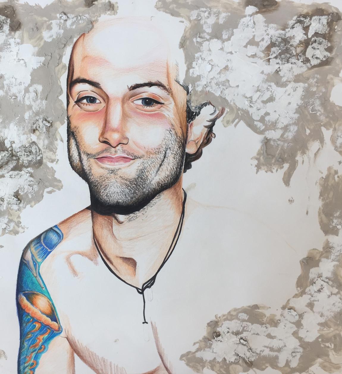 Student Art Work. Partially completed portrait drawing of a shirtless man with a slight smile, detailed facial features, and a colorful jellyfish tattoo on his shoulder, surrounded by unfinished areas with textured gray and white paint.
