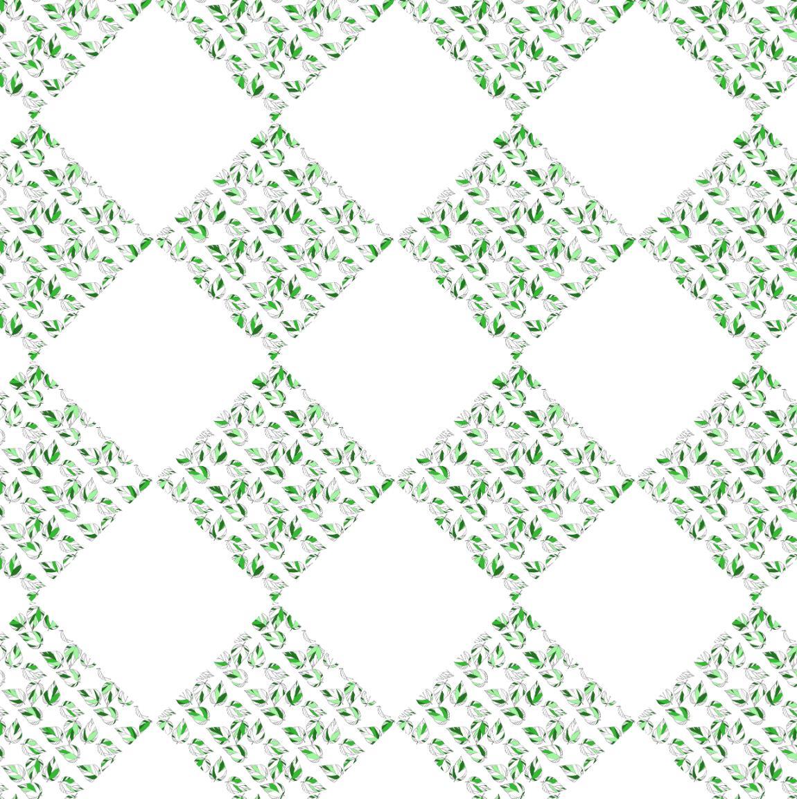 Student Art Work -Repeating diamond pattern of green and white leaves on a white background, creating a checkerboard effect with alternating filled and empty diamond shapes.