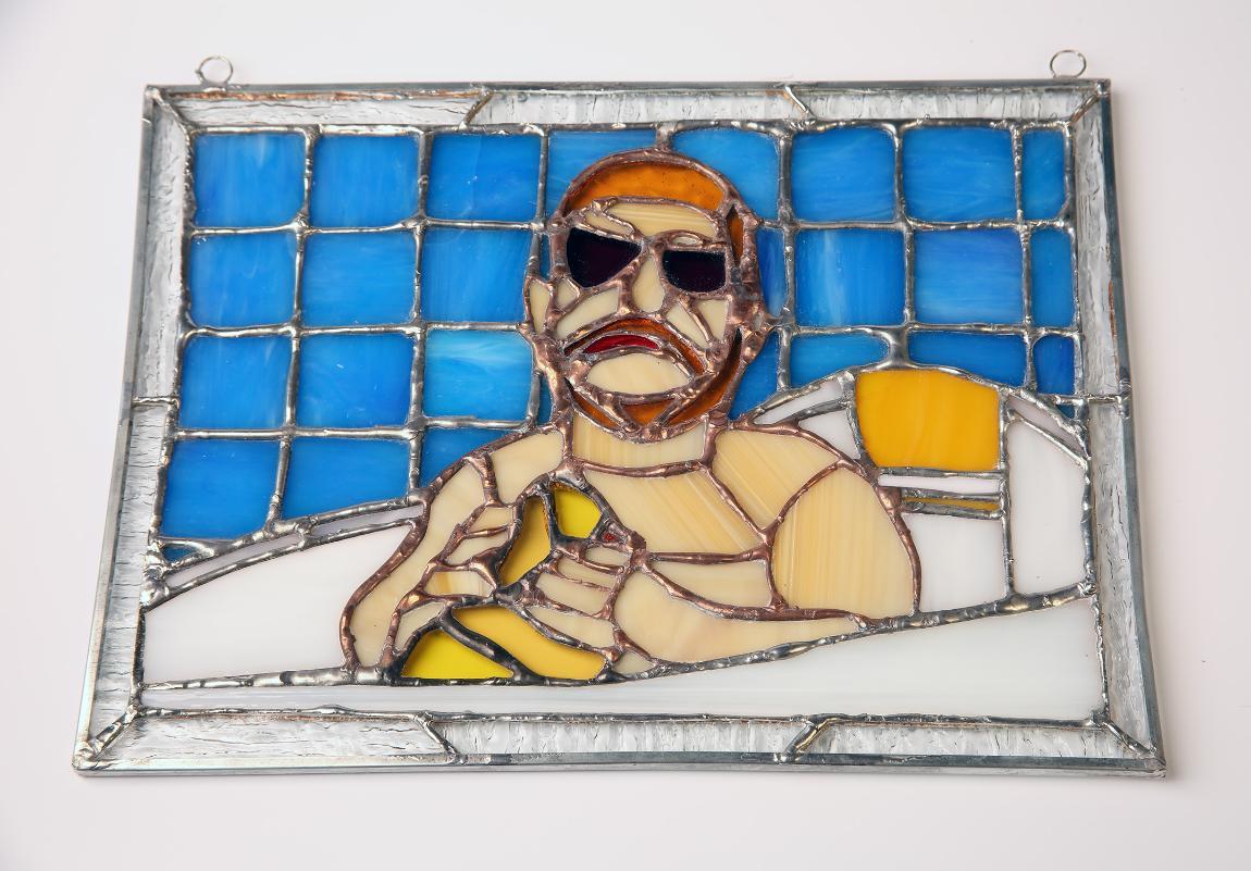 Student Art Work. Colorful stained-glass artwork depicting a person with a beard and sunglasses holding a yellow object, set against a grid of blue squares with white and yellow accents.