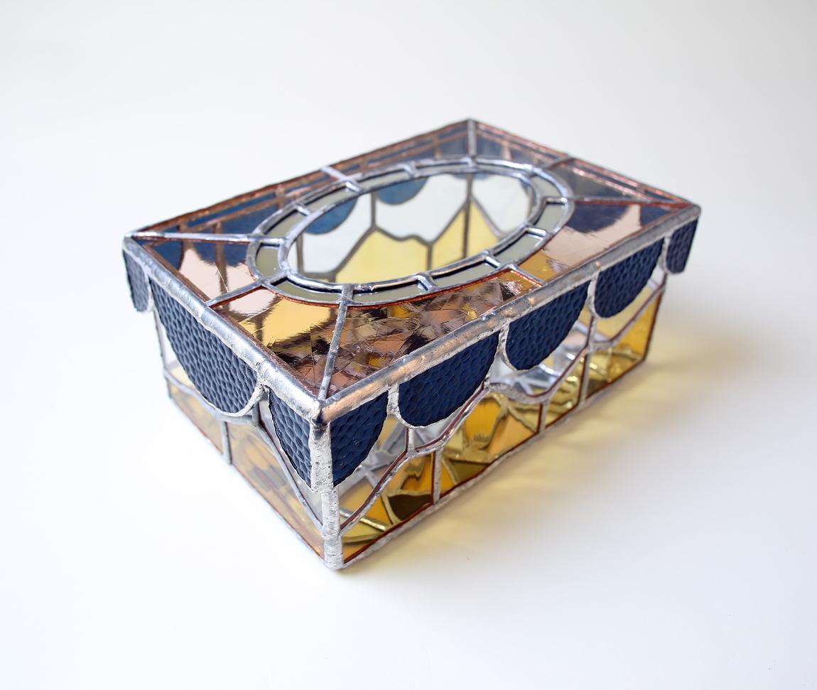 Student Art Work. Rectangular stained-glass box with a hinged lid, featuring amber, navy blue, and clear glass panels with an oval mirror inset on the top.