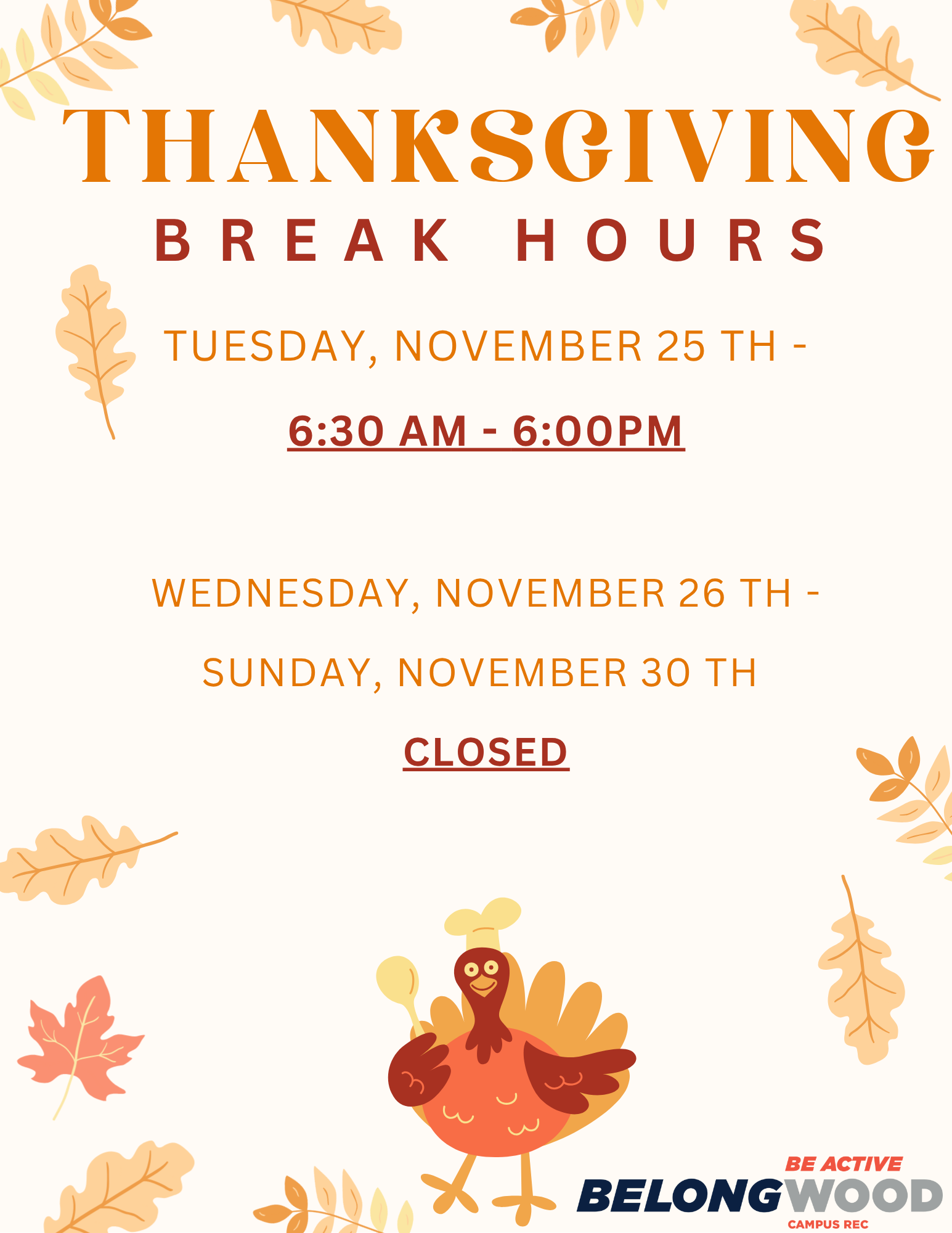 Thanksgiving Break Hours at Pierson Hall Fitness Center