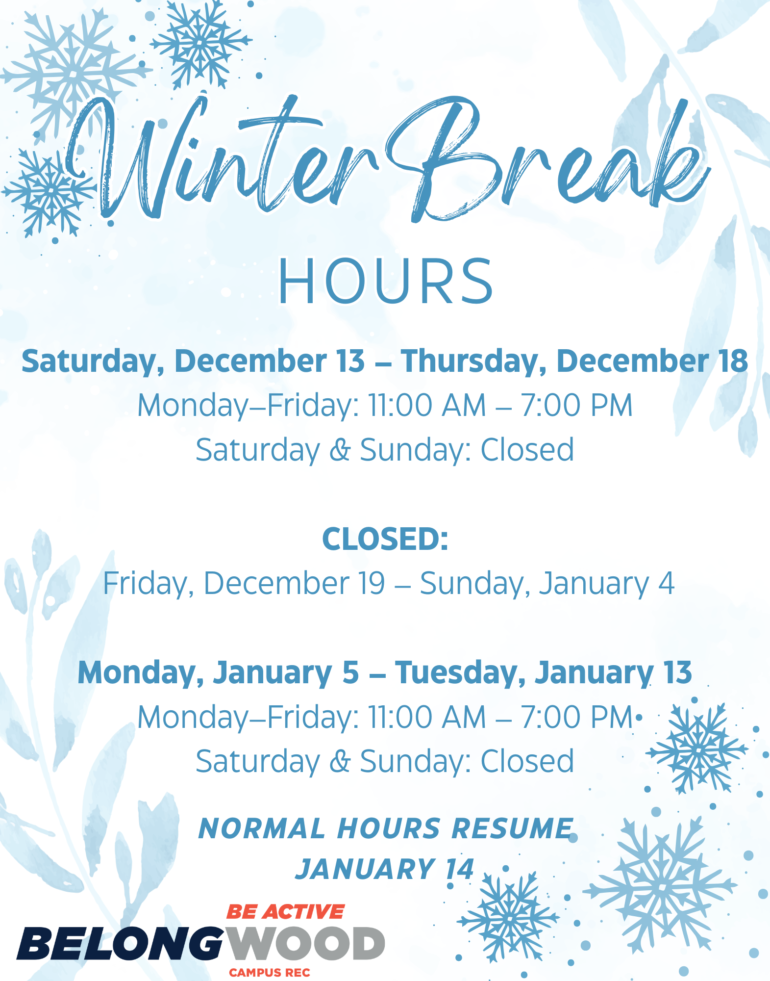 Winter Break Hours at Pierson Hall Fitness Center