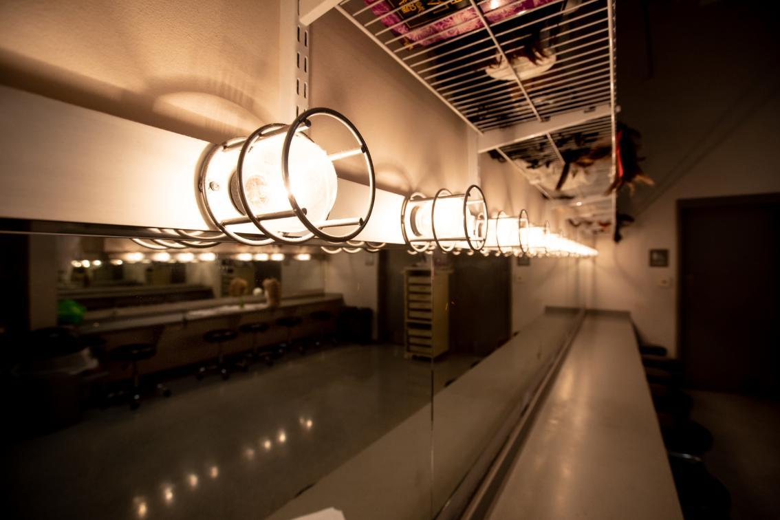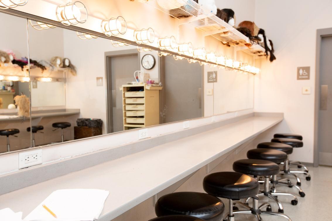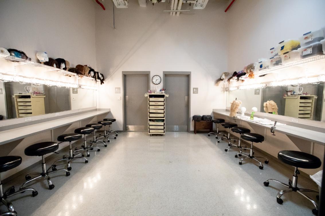 There is a large makeup area and two dressing rooms, complete with lockers and showers.